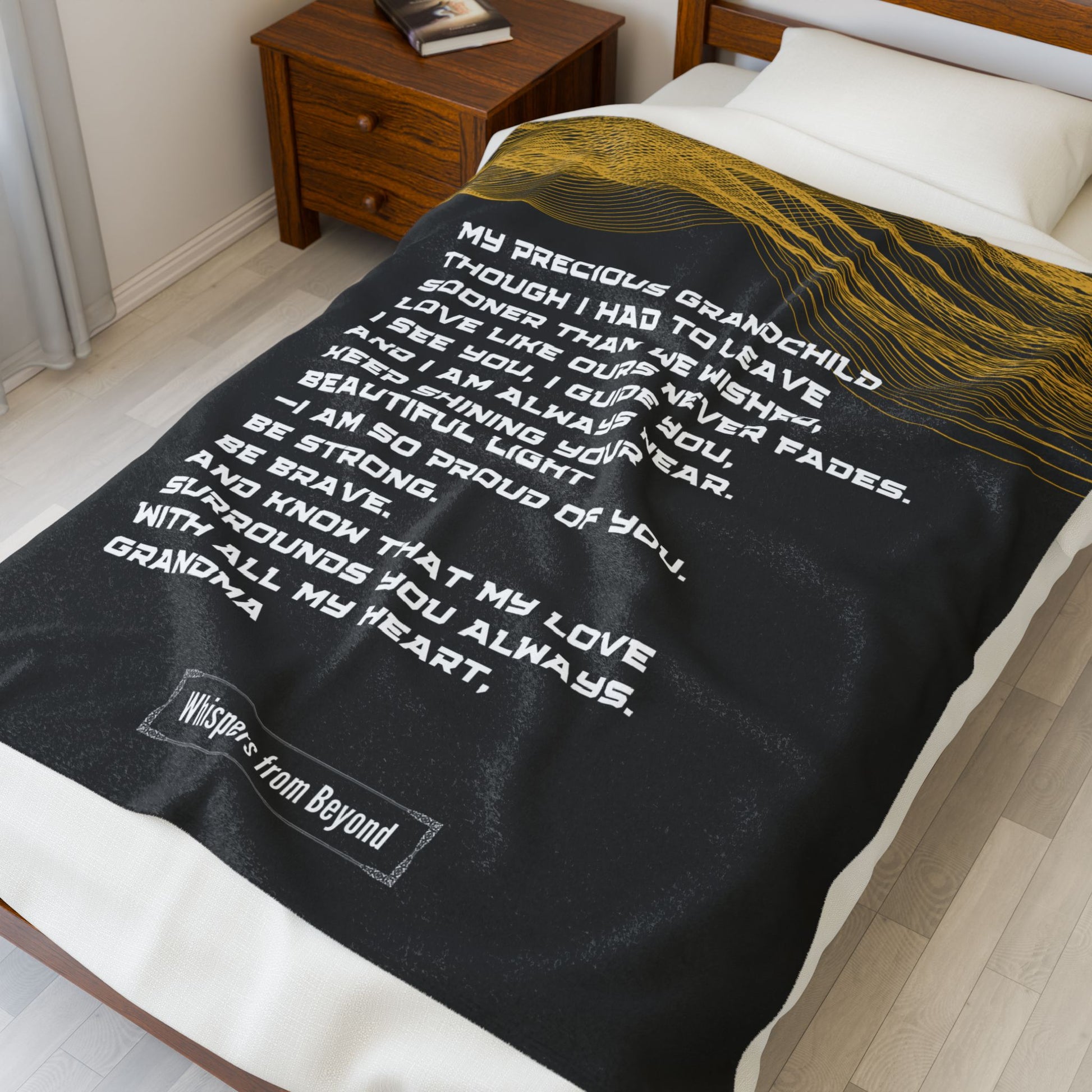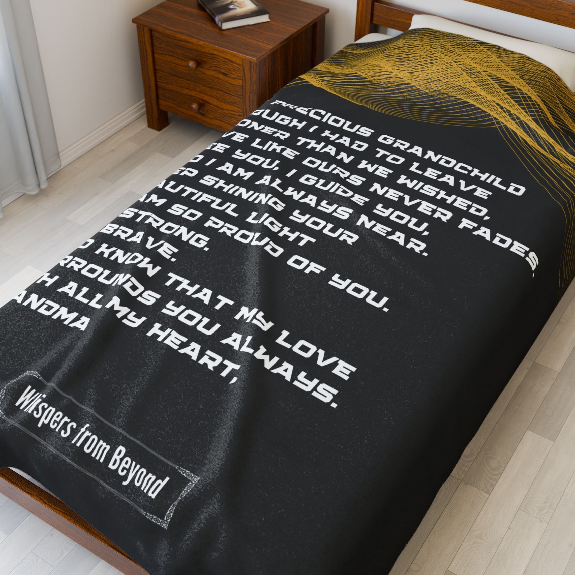 A grandmother’s love is eternal, always surrounding and guiding her precious grandchild. This heartfelt blanket carries a loving message from a grandmother in spirit, offering warmth, comfort, and a reminder that she is always near. A cherished keepsake, it serves as a daily embrace of love, strength, and encouragement.