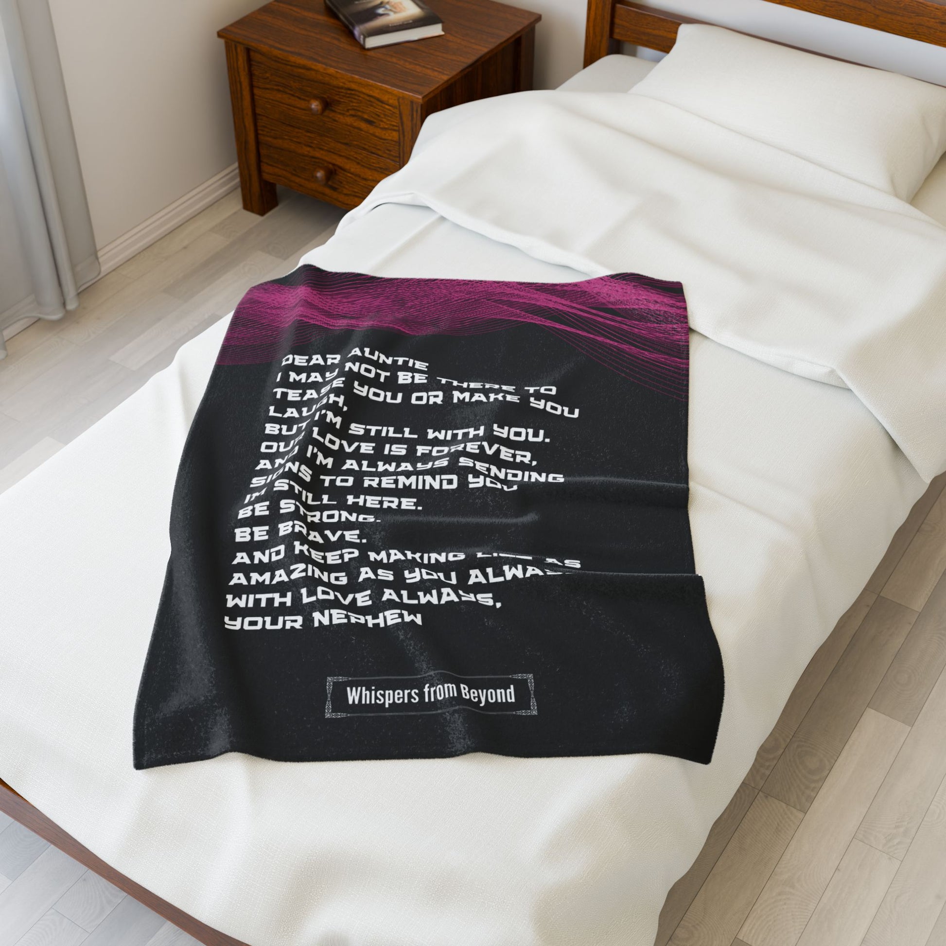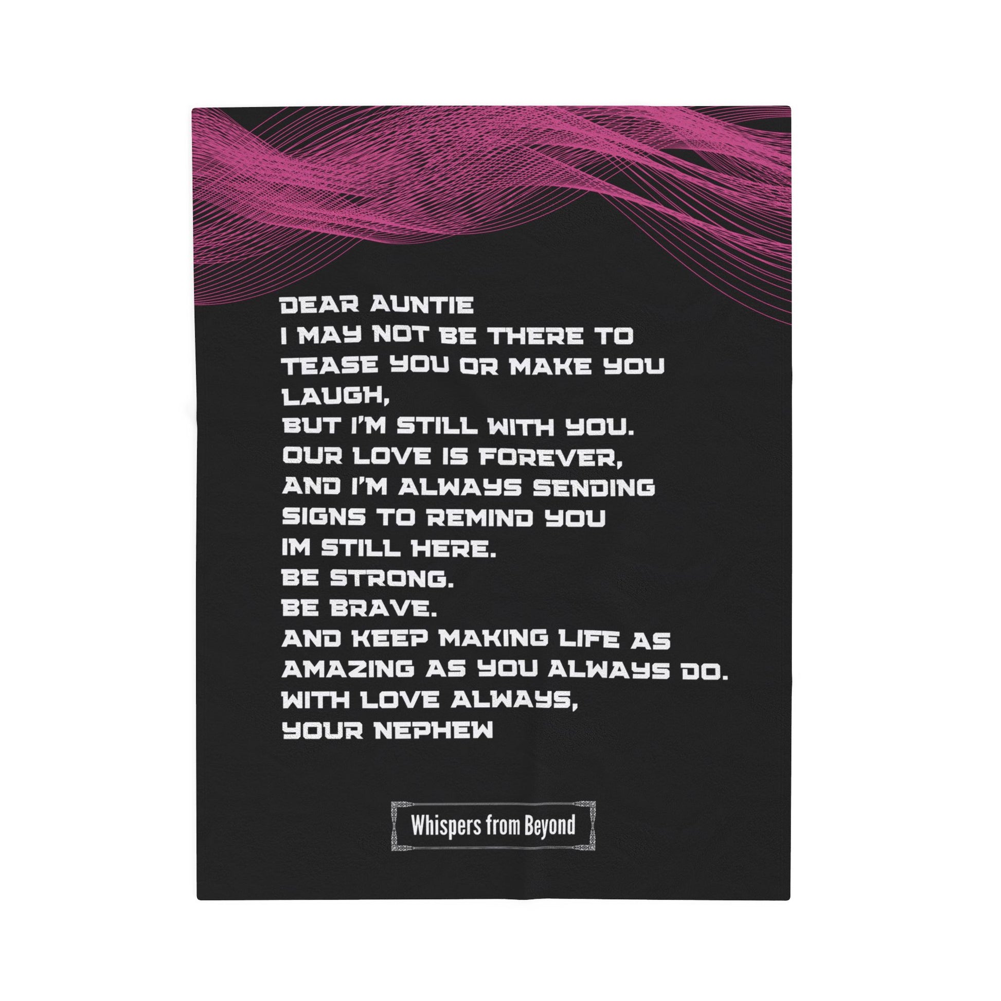 The love between a nephew and his aunt never fades, even from beyond. This comforting blanket carries a heartfelt message from a nephew in spirit, reminding his aunt that their bond is eternal. A beautiful keepsake that offers warmth, strength, and the reminder that love continues to send signs, guiding and watching over her every step of the way.