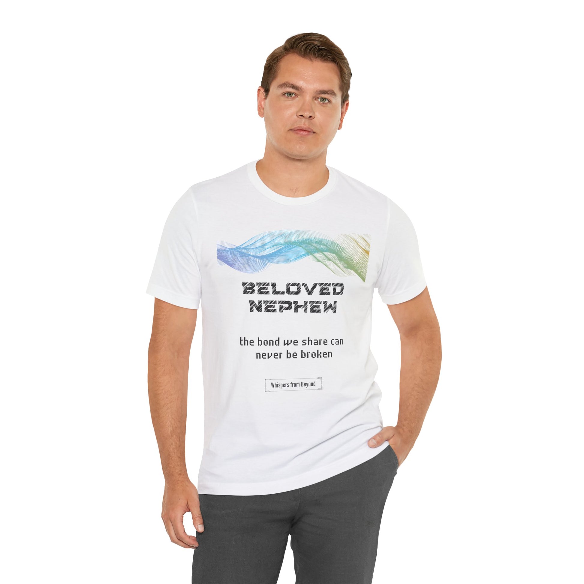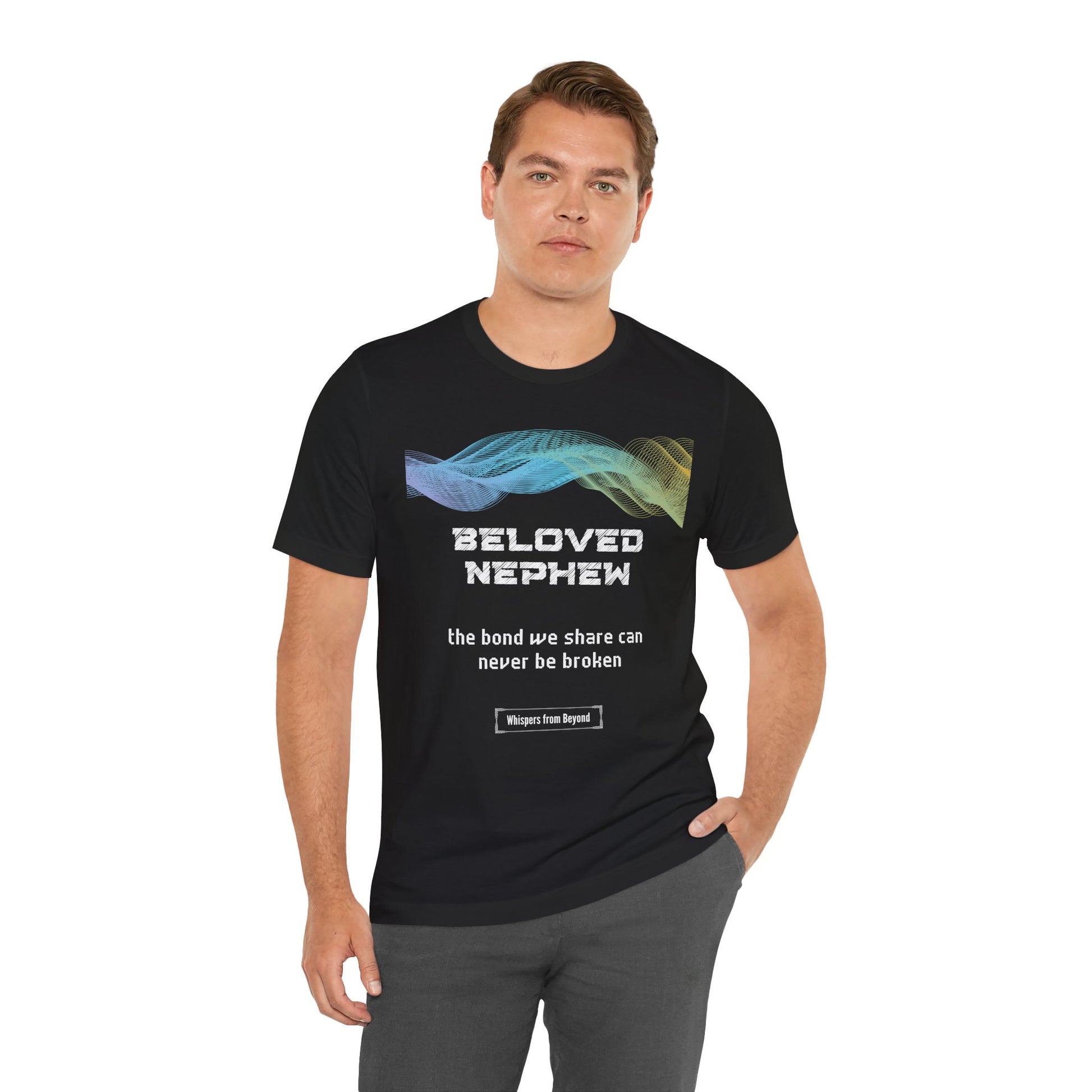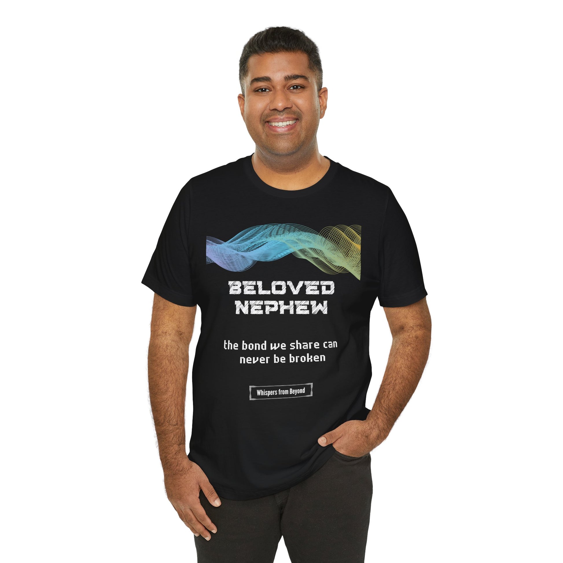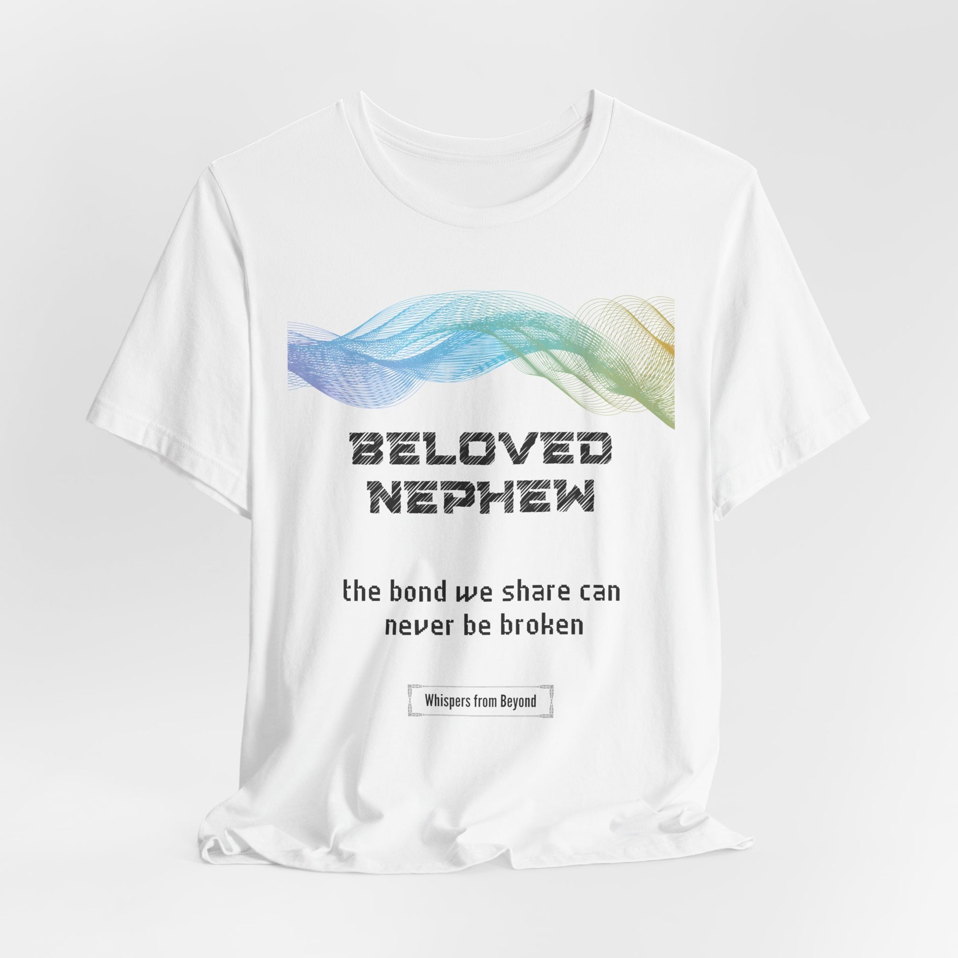 This heartfelt message from a soul to their nephew affirms that no matter the distance or time, the bond they share is eternal and unbreakable. It serves as a comforting reminder that love transcends the physical realm, and the connection remains strong, offering peace and reassurance. This design is a beautiful tribute to the lasting, unshakable love between a soul and their beloved nephew. A heartfelt whisper from an aunt or uncle to their beloved nephew, reminding him that the special bond they share transcends time and distance. A comforting memorial shirt for remembrance and enduring love.