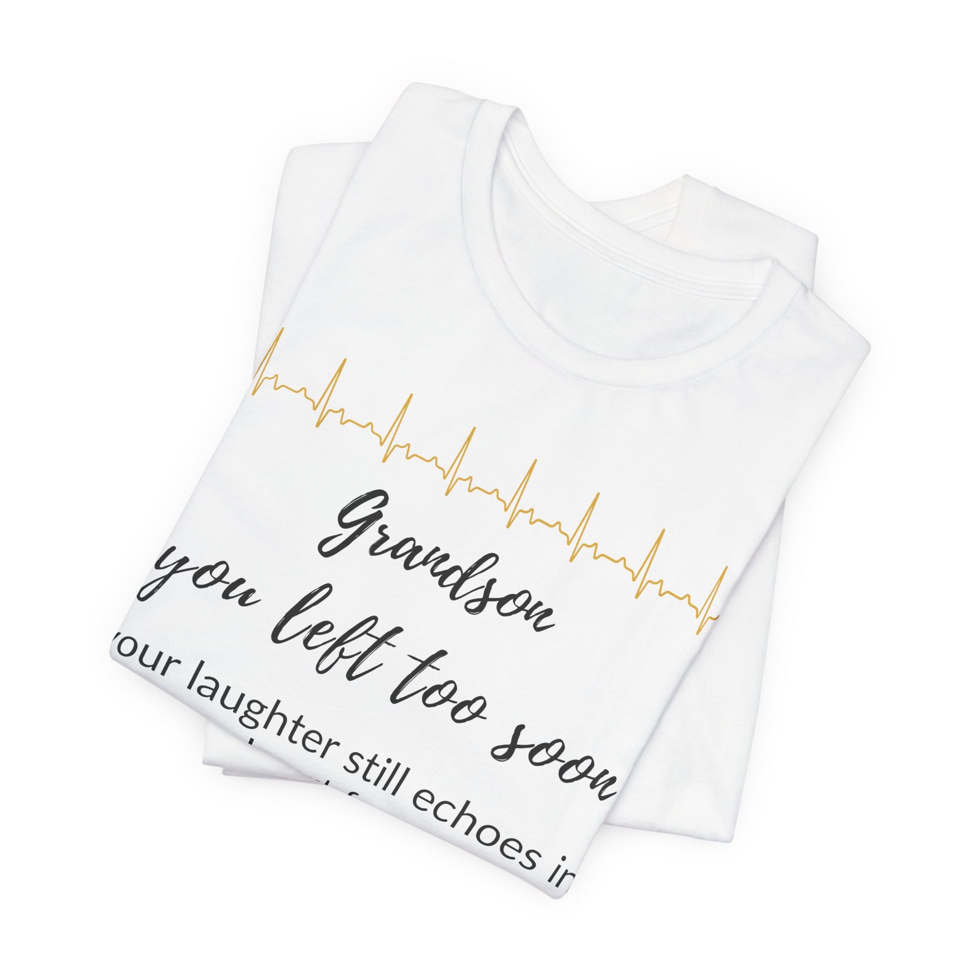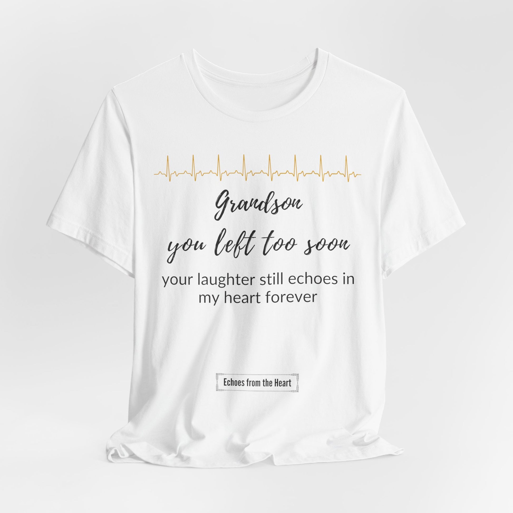 A heartfelt memorial shirt for a grandparent, honoring the memory of a beloved grandson who left too soon. With the tender message, “Grandson you left too soon, your laughter still echoes in my heart forever,” this shirt serves as a loving tribute to the joy he brought and the bond that will never fade.