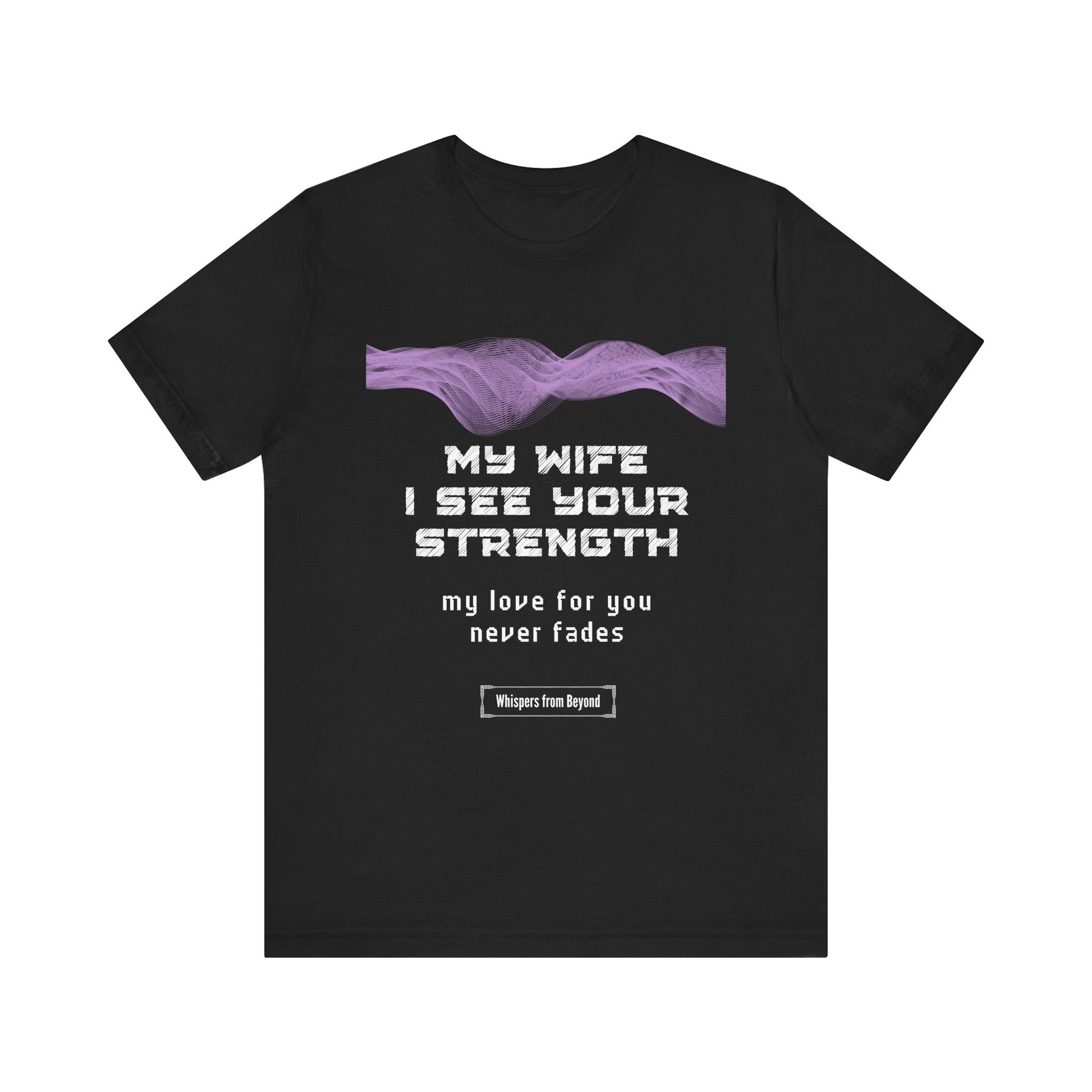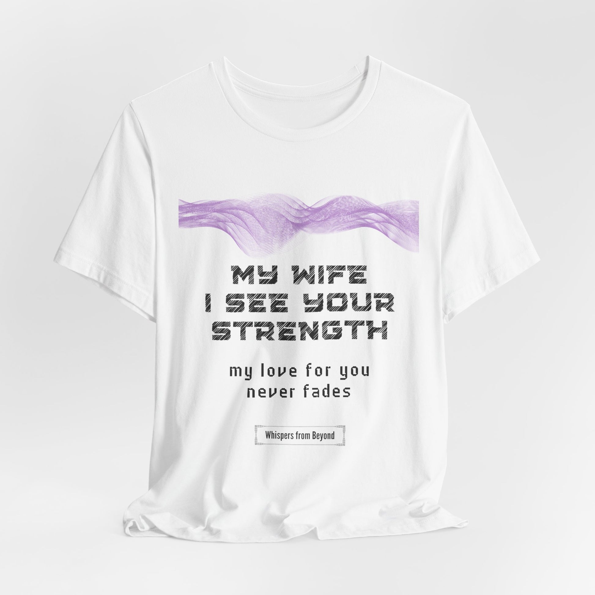 This touching message from a soul to their wife reassures her that their love is everlasting, no matter the physical distance. Their bond remains unbroken, and in every breath, the soul continues to love her. This design beautifully represents the eternal connection between husband and wife, offering comfort and peace, knowing that love transcends beyond the physical world. A heartfelt whisper from a husband in spirit to his wife, acknowledging her strength and assuring her that his love remains constant and unfading. A comforting memorial shirt for enduring love and remembrance.