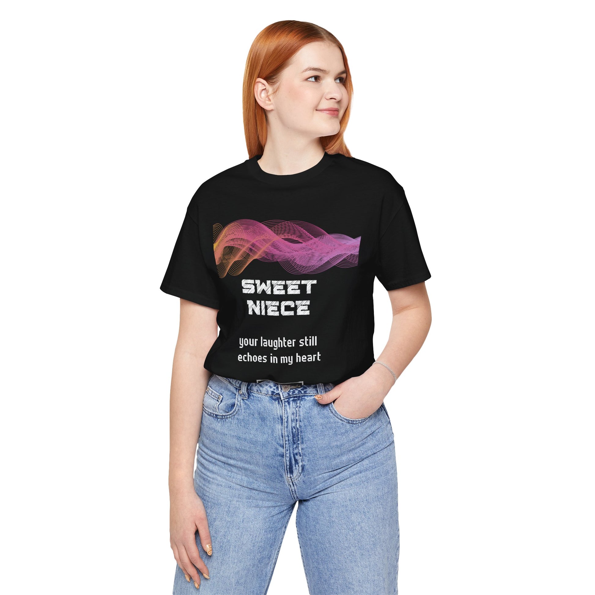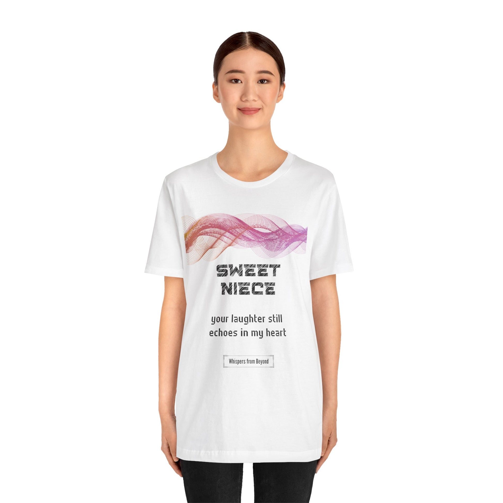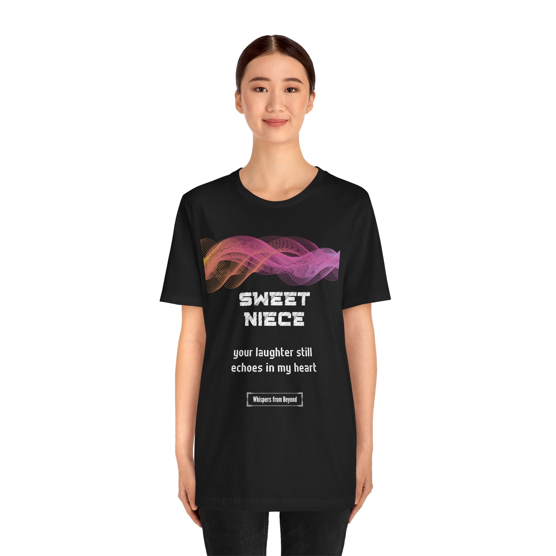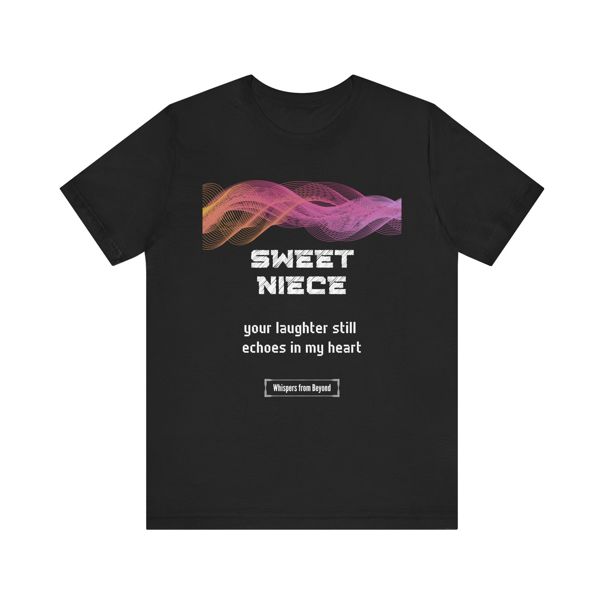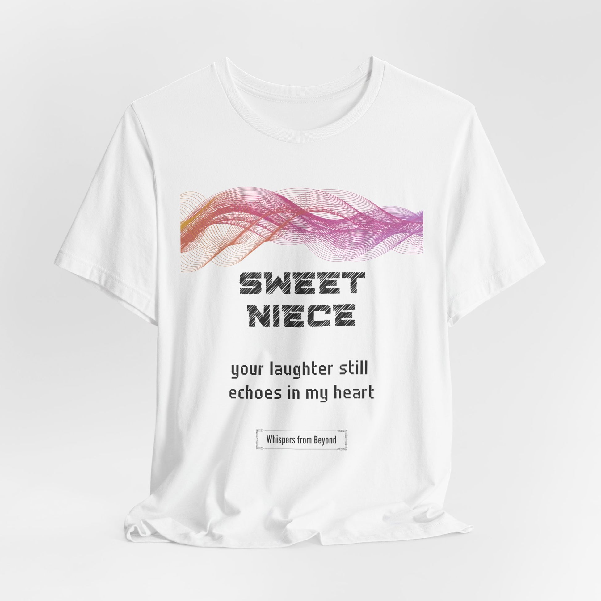 A heartfelt whisper from an uncle or aunt to their sweet niece, reminding her that her joyful spirit and laughter continue to live on in their heart. This touching memorial T-shirt offers comfort and remembrance for those grieving the loss of a niece. Perfect for anyone looking for a sympathy gift or memorial clothing for their sweet niece.